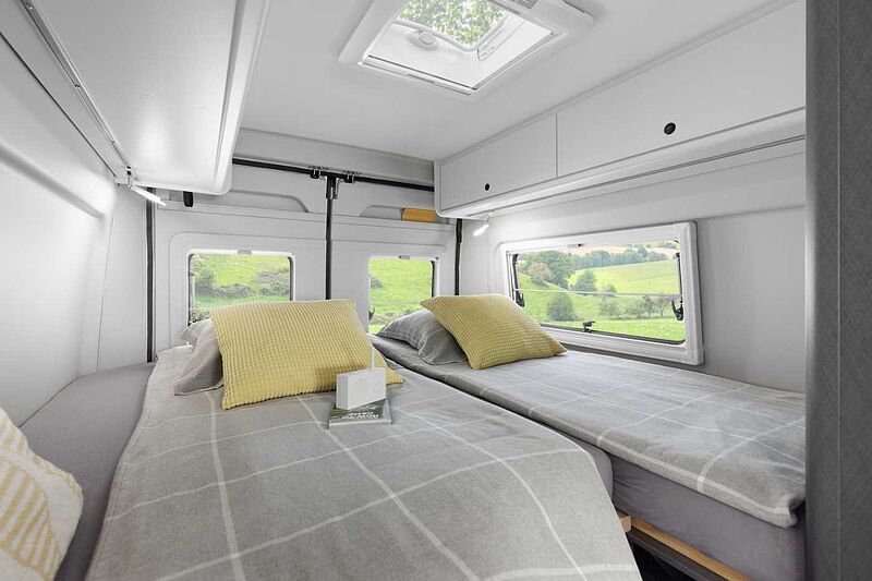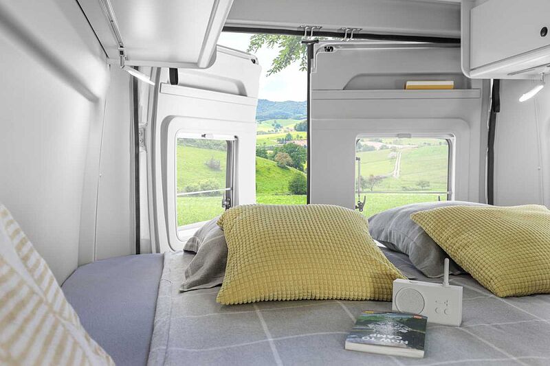 Schottwand inkl. Aufstiegstritt für Heckdoppelbett, Hochwertige Matratzen für erhöhten Liegekomfort, Heckbett mit Lattenrost, Ergonomisch geformte Polster für mehr Sitzkomfort, Isofix Kindersitzbefestigung für hintere Sitzbank,