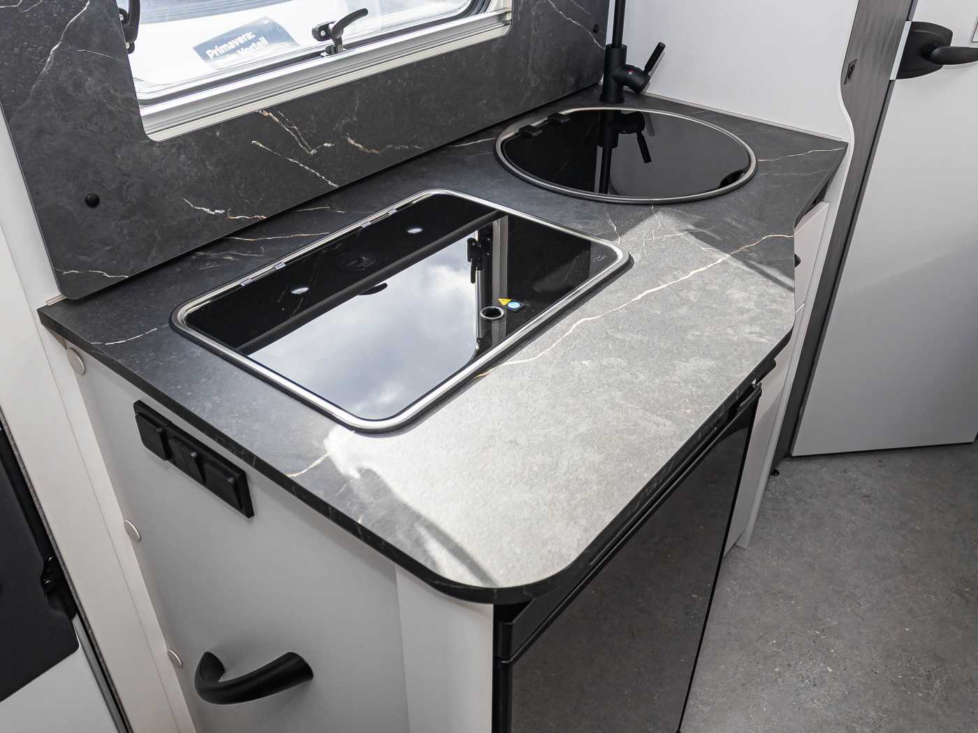 • Ergonomisch angeordnete Küche mit großzügiger Arbeitsfläche • Geräumige Schubkästen mit Soft-Close im Küchenblock • Indirekte LED-Beleuchtung unter Arbeitsplatte • Zwei-Flammkocher mit 12 V Zündung und Glasabdeckung (T 7400 SBC | QBC) • Drei-Flammkocher mit 12 V Zündung und Glasabdeckung • Großes Rundspülbecken aus Edelstahl mit Abdeckung • Flex-Schienensystem mit 2 Haken • Frischwassertankkapazität 110 l, Abwassertank 90 l • Kühlschrank 78 l mit Gefrierfach 11 l (T 5900 FB) • Kühlschrank 137 l mit Gefrierfach 15 l • Abfalleimer