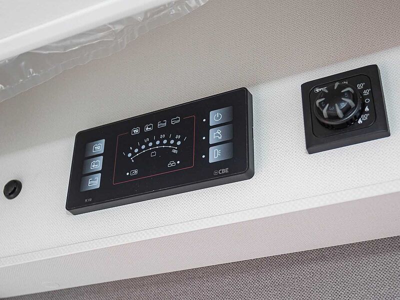 LED-Beleuchtung integriert unter den Dachschränken, LED-Wohnraumleuchte, LED-Außenleuchte, Leistungsstarke, wartungsfreie Aufbaubatterie (95 Ah), Bord-Control-Panel, Elektrischer Ladeautomat für Aufbau- und Fahrzeugbatterie 12 V | 18 A, CEE-Außenanschluss für 230 V mit Sicherungsautomat, FI-Schutzschalter, USB-Steckdosen
