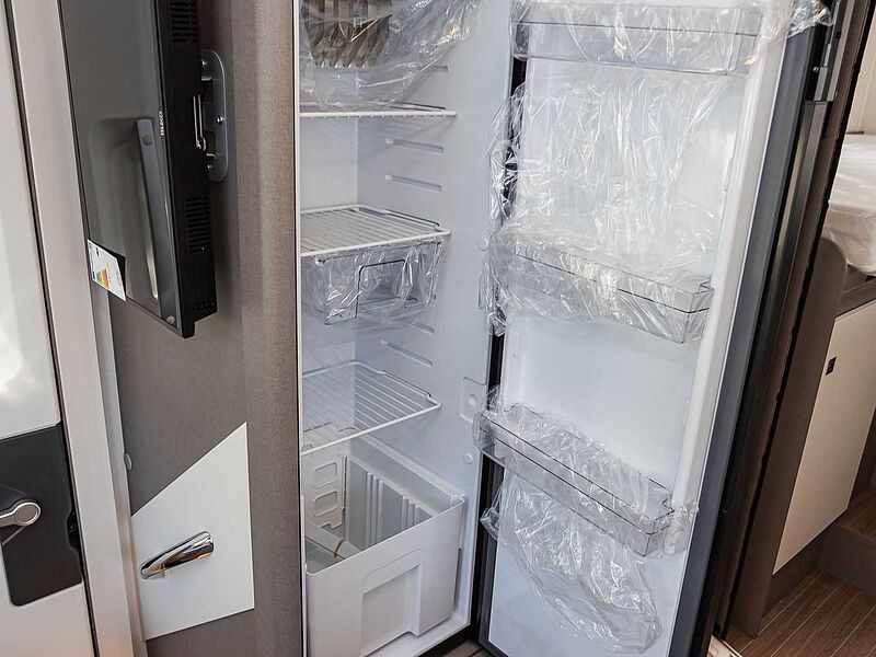 Glasabdeckung (T 7.3 SCF | QCF) • Großes Rundspülbecken aus Edelstahl mit Abdeckung • Flex-Schienensystem mit 2 Haken • Frischwassertankkapazität 110l, Abwassertank 100l • Kühlschrank 137 l mit Gefrierfach 15 l • Abfalleimer