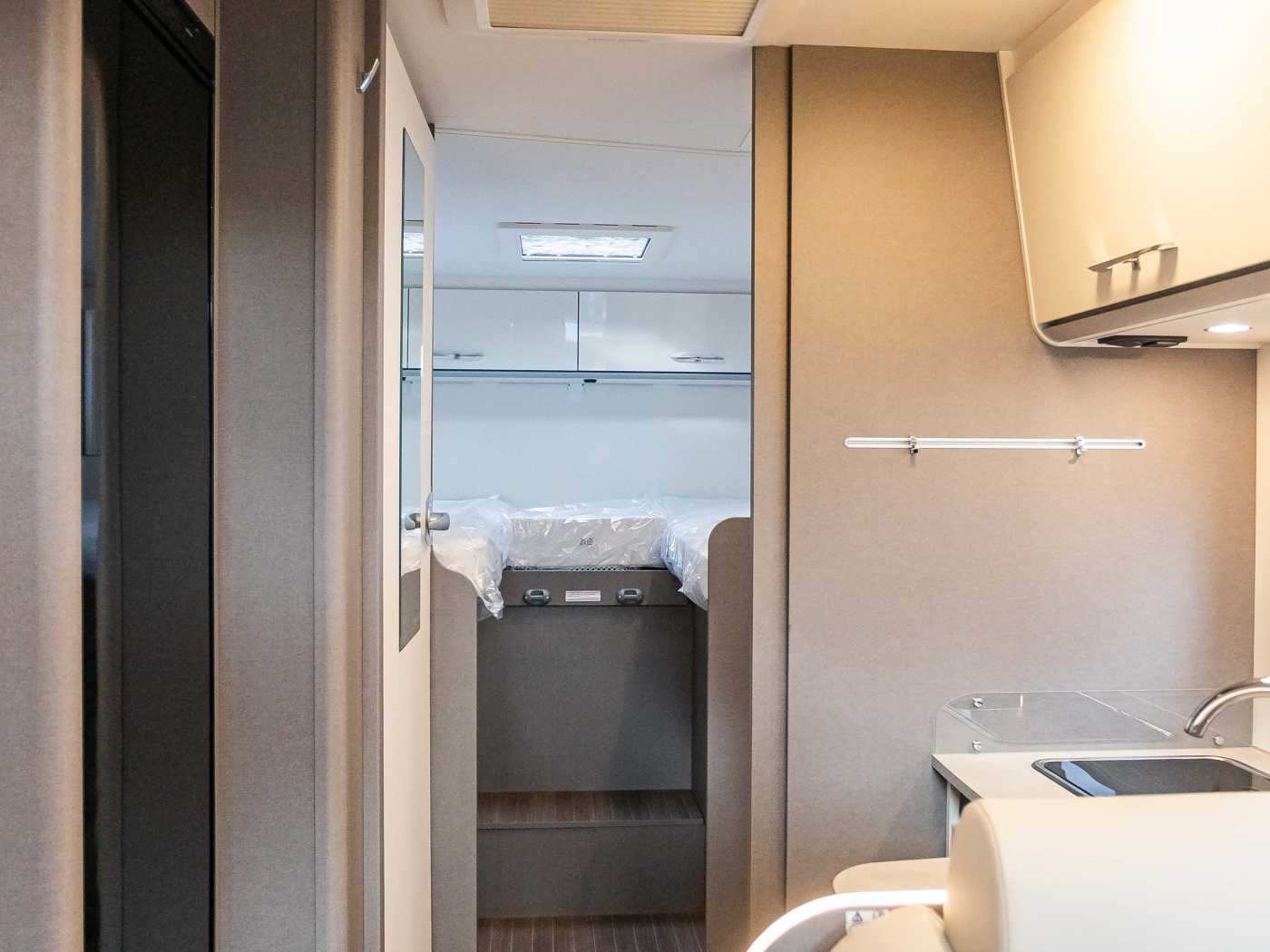 Glasabdeckung (T 7.3 SCF | QCF) • Großes Rundspülbecken aus Edelstahl mit Abdeckung • Flex-Schienensystem mit 2 Haken • Frischwassertankkapazität 110l, Abwassertank 100l • Kühlschrank 137 l mit Gefrierfach 15 l • Abfalleimer