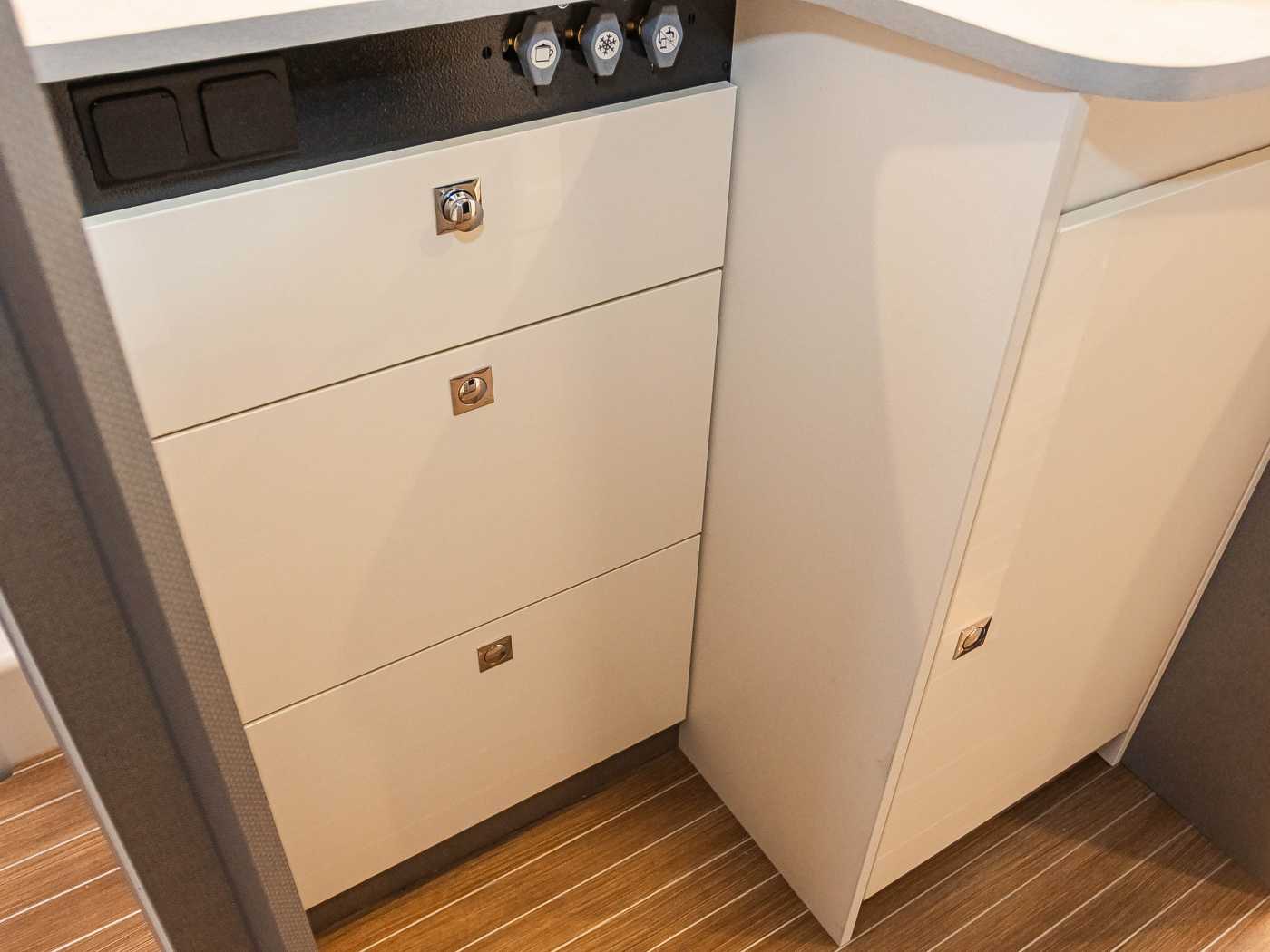 • Ergonomisch angeordnete Küche mit großzügiger Arbeitsfläche • Geräumige Schubkästen mit Soft-Close im Küchenblock • Drei-Flammkocher mit 12 V Zündung und Glasabdeckung • Zwei-Flammkocher mit 12 V Zündung und