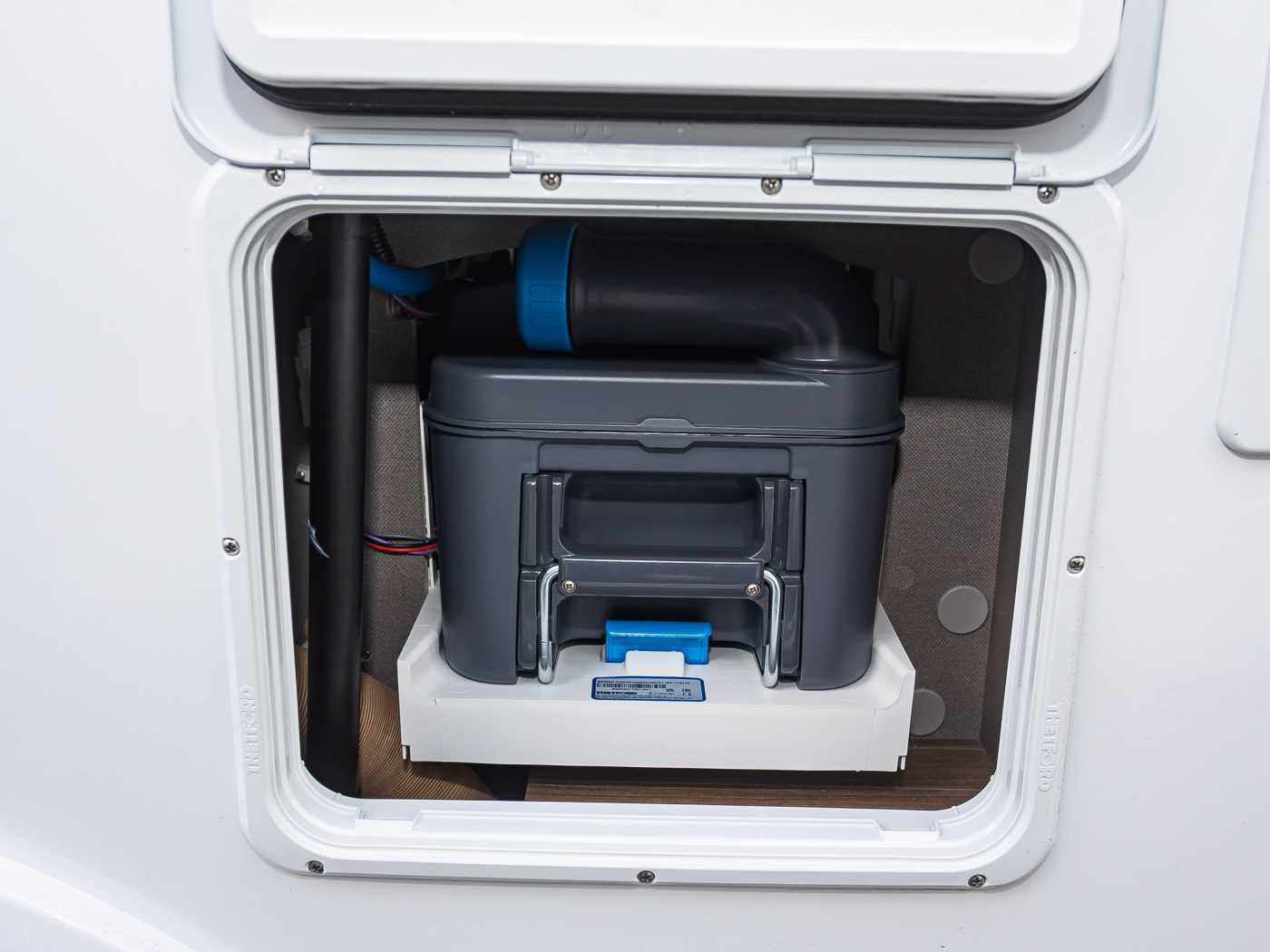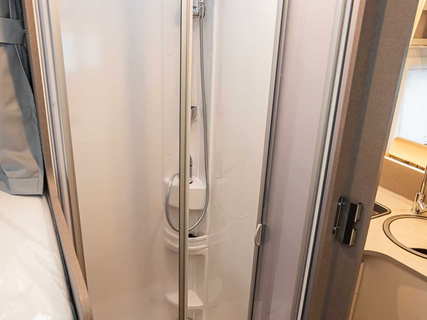 • Variobad (T 6.9 SF) • Geräumiges Raumbad mit gegenüberliegender separater Dusche • Kassettentoilette mit elektrischer Pumpe und drehbarem Sitz • Duschraumverkleidung • Dachhaube mit integriertem Insektenschutzrollo • Große Spiegelflächen • Kleiderstange in der Nasszelle