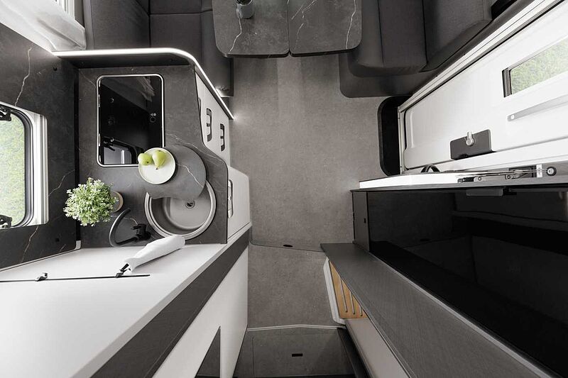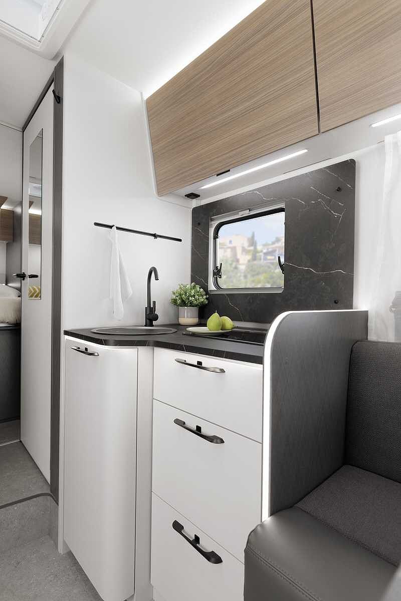 KÜCHE / WASSERVERSORGUNG • Ergonomisch angeordnete Küche mit großzügiger Arbeitsfläche • Geräumige Schubkästen mit Servo-Soft im Küchenblock (modellabhängig) • Drei-Flammkocher mit gusseisernem Topfträger und Glasabdeckung in schwarz (außer T 7400 QBC und T 7400 SBC und Van) • Großes Rundspülbecken aus Edelstahl mit Glasabdeckung in schwarz mit Abdeckung (außer Van) • Wassertank inkl. Boiler 122 l, Abwassertank 92 l • Kühlschrank 113 l mit Gefrierfach 14 l • Indirekte LED-Beleuchtung unter Arbeitsplatte • Abfalleimer