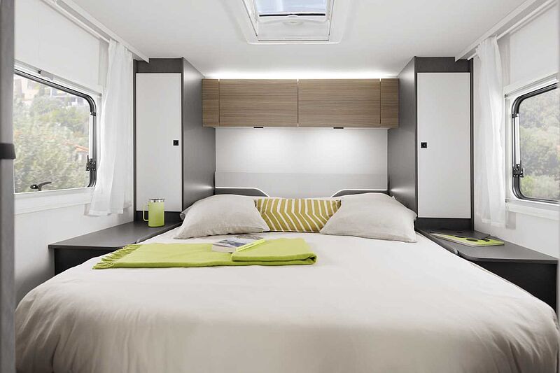 WOHN-/SCHLAFKOMFORT • Ergonomisch geformte Polster für mehr Sitzkomfort • Gemütliche L-Sitzgruppe mit freistehendem, dreh- und schwenkbaren Tisch beim T 7400 QB / T 7400 SB • Tischplattenverlängerung (außer T 7400 QB / T 7400 QBC / T 7400 SBC / T 7400 SB / A 7300 DB / A 6600 BB) • Gemütliche Lounge-Sitzgruppe mit freistehendem Tisch beim zum Abklappen beim T 7400 QBC und T 7400 SBC • Hochwertige Matratzen mit erhöhtem Liegekomfort in allen Betten • Matratzenbezüge abnehmbar und waschbar • Großzügige Stauräume und Ablagemöglichkeiten • Hinterlüftete Stauschränke und Truhen • Komfortabler Alkoven mit Seitenfenster rechts, 66 cm Kopffreiheit (A-Modelle) • Alkovenbett klappbar für besseren Zugang zum Fahrerhaus (A-Modelle) • Sicherheitsnetze am Alkoven-Bett • Möbeldekor Tela Sand & White • Fußboden Nautic Breeze