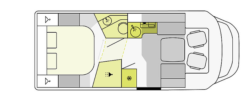 BORDTECHNIK • LED-Beleuchtung integriert unter den Dachschränken • LED-Wohnraumleuchte • Indirekte LED-Beleuchtung im Raumteiler • LED-Außenleuchte • Leistungsstarke, wartungsfreie AGMAufbaubatterie (95 Ah) • Bord-Control-Panel mit Angabe aller Füllstände und Batteriekapazitäten • Zuschalt-/Trennautomatik für Starterund Aufbaubatterie sowie Kühlschrank • Elektrischer Ladeautomat für Aufbauund Fahrzeugbatterie 12 V / 18 A • CEE-Außenanschluss für 230 V mit Sicherungsautomat • FI-Schutzschalter • 4x USB-Steckdose