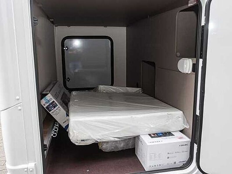 AUFBAU • 7 Jahre Dichtigkeitsgarantie * • Dach- und Heckaußenhaut aus widerstandsfähigem GFK • Dach- und Wandstärke 34 mm, Fußbodenstärke 41 mm • Seitenwandaußenhaut aus Aluminium-Glattblech • Formschöner Heckleuchtenträger dreiteilig mit integrierten Leuchten • Hochwertige Aufbautür mit Fenster und Ablagefächer sowie einer ergonomischen Griffposition innen und außen (außer Van) • Fliegengittertür (einteilig) • Ausstellfenster doppeltverglast mit Verdunkelungsrollo und Fliegenschutz (ausgenommen Toilettenraumfenster) • Dachhaube in Milchplexiglas mit Fliegenschutz • Elektrische Trittstufe • Großzügige Heckgarage mit Rahmenabsenkung, Antirutschfläche, Sicherungsösen und Innenbeleuchtung (modellabhängig) • Zuladung Heckgarage bis zu 150 kg