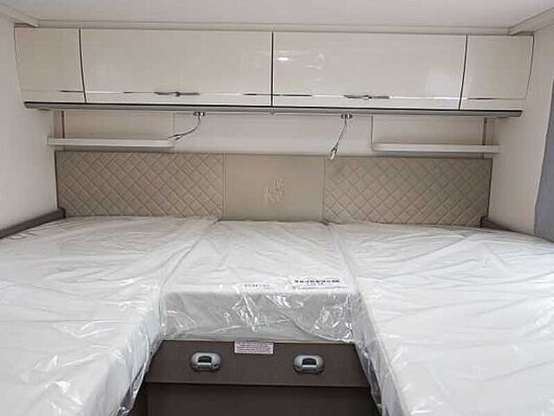 WOHN-/SCHLAFKOMFORT • Ergonomisch geformte Polster für mehr Sitzkomfort • Gemütliche L-Sitzgruppe mit freistehendem, dreh- und schwenkbaren Tisch beim T 7400 QB / T 7400 SB • Tischplattenverlängerung (außer T 7400 QB / T 7400 QBC / T 7400 SBC / T 7400 SB / A 7300 DB / A 6600 BB) • Gemütliche Lounge-Sitzgruppe mit freistehendem Tisch beim zum Abklappen beim T 7400 QBC und T 7400 SBC • Hochwertige Matratzen mit erhöhtem Liegekomfort in allen Betten • Matratzenbezüge abnehmbar und waschbar • Großzügige Stauräume und Ablagemöglichkeiten • Hinterlüftete Stauschränke und Truhen • Komfortabler Alkoven mit Seitenfenster rechts, 66 cm Kopffreiheit (A-Modelle) • Alkovenbett klappbar für besseren Zugang zum Fahrerhaus (A-Modelle) • Sicherheitsnetze am Alkoven-Bett • Möbeldekor Tela Sand & White • Fußboden Nautic Breeze