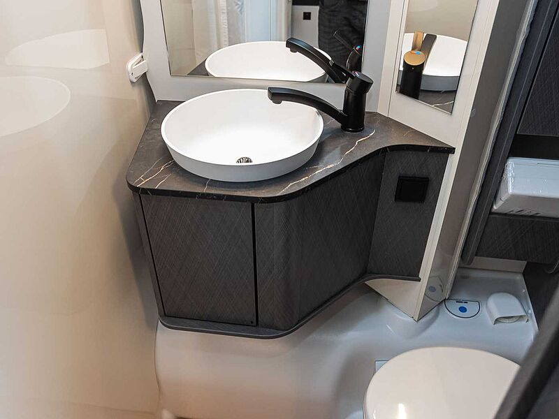 und Glasabdeckung • Geräumige Schubkästen mit Soft-Close im Küchenblock • Kühlschrank 78 l mit Gefrierfach 11 l • Frischwassertankkapazität 110l, Abwassertank 100l (V 5.9 DF: 95l) • Abfalleime