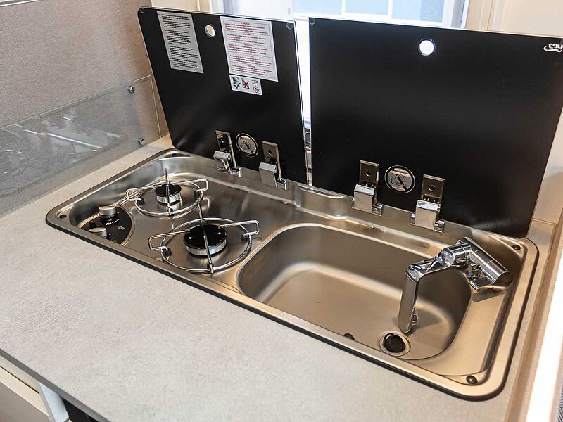 • Ergonomisch angeordnete Küche mit großzügiger Arbeitsfläche • 2-Flammkocher mit Piezozündung