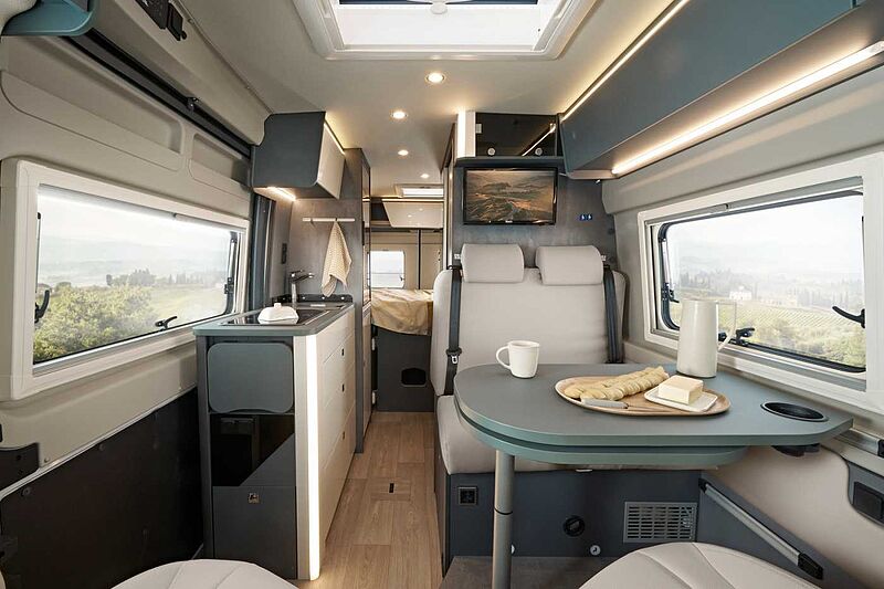 Serienausstattung: Chassis-/GewichtsvariantenFiat Ducato Light 3.500 kg 2.2 180 PS (Light Duty) + AutomatikgetriebeBasisReifenreparaturset Fix & Go60 l KraftstofftankElectronic Stability Control: ESC, ABS, ASR, Hill Holder, Roll Over Mitigation, Crosswind Assist, Trailer Stability Control System, Post Collision Braking SystemTempomatTraction+, Hill Descent ControlAußenspiegel elektrisch verstellbar u. beheizbar, mit integrierten BlinkleuchtenElektrische Fensterheber im FahrerhausFahrer- und BeifahrerairbagHöhenverstellbares LenkradLenkrad und Schaltknauf in EchtlederManuelle Klimaanlage im FahrerhausRadiobedienung am LenkradVorbereitung für DAB-Autoradio und Lautsprecher im FahrerhausAntenne DABEco-Pack mit Start&StopZentralverriegelung Fahrerhaus und WohnraumVorrichtung DieselheizungNebelscheinwerfer mit KurvenlichtInduktive Smartphone-LadestationDigitale Instrumentenanzeige mit 7 TFT-FarbdisplayTPMS (Reifendruckkontrollsystem)Elektrische FeststellbremseFull-LED-ScheinwerferAdaptive Geschwindigkeitsregelanlage (ACC) > 30km/hAutonomer Notbremsassistent mit Fußgänger- und Radfahrererkennung, Spurhalteassistent (Lane Support System), Regen- und Dämmerungssensor, Verkehrszeichenerkennung + FernlichterkennungKlimaautomatik mit PollenfilterChassis-Außenfarbe Mugello Grün18“ Racing-Leichtmetallräder (bronze)AufbauXPS, Boden und Dach, Wände und Dach isoliert mit Alu-EcofiberDoppelbodenstauraum mit Innenbeleuchtung (Sitzgruppe)Panorama-Dachluke 70 × 50 cm im WohnraumDachluke 40 × 40 cm im SchlafzimmerDachluke 28 x 28 cm im BadFenster im BadElektrische Trittstufe (Aufbautür)RahmenfensterAusbauDrehbare Fahrerhaussitze mit Armlehnen, höhenverstellbar, im Wohnraumstoff bezogenMaximierte Innenraumhöhe im Fahrerhaus und über WohnsitzgruppeStaufächer und indirekte Beleuchtung in der T-HaubeKopfstützen Sitzgruppe mit HöhenregulierungGarderobenschrank mit AuszugsschieneOptimierter Möbelbau für Anti-Kondensations-Effekt, Luft- und Wärmezirkulation sowie optimale Wärmeverteilung in Wohn- und SchlafraumWohnraumdecke gepolstert und verkleidetISOFIX (2 Sitzplätze)Ausziehbarer TischHeckstauraum mit vier VerzurrösenHerausnehmbare Trennwand zwischen Wohn- und Laderaum mit Tür für InnenzugangVerdunklungsplissee Fahrerhaus für Front- und SeitenscheibenSchiebetür mit FliegengitterWohn- und Schlafraum & BeleuchtungBetten mit HolzlattenrostVerstellbare Leselampen mit USB-SteckdosenLED BeleuchtungskonzeptKlappbare Heckbetten zur einfachen Beladung von sperrigem GepäckKomfortable "Ergonomy"-Matratzen, Anti-Milben, mit atmungsaktivem Stretch-Futter, waschmaschinenfestIndirekte Beleuchtung, dimmbarSchlafzimmerwände mit Eco-Leder-VerkleidungKücheKüchenoberfläche und Tisch, kratzfest und pflegeleicht (Fenix®)2-Flammen-Kochfeld und Spülbecken aus EdelstahlKompressor-Kühlschrank 84 lKüchenschubladen softclose230 V Steckdose in der KücheIndirekte Beleuchtung unter der KüchenplatteKlappbares Regal in der KücheBadezimmerVariobad mit integrierter abtrennbarer Maxi-DuscheToilette und herausnehmbarer Tank (frostbeständig)Schiebetür zum BadDuscheinlage aus HolzInstallation & TechnikDieselheizung Combi 6 - 6kWHeizung mit digitalem Bedienpanel und ZeitsteuerungAutomatisches Batterieladegerät 22 ABord-Kontrollpanel mit LED-AnzeigeWohnraumbatterie (95 Ah)Stromversorgung und Aufladen mobiler Geräte über USB-SteckerSteckdose in der GarageStauraum für 2 GasflaschenFrischwassertank innenliegend, leicht zugänglich, elektrische TauchpumpeAbwassertank mit SicherheitsventilAbflussrohre mit Siphon und Abwassertank mit externer Entlüftung, gegen GeruchsbildungBeheizter AbwassertankVorbereitung RückfahrkameraLED-Außenleuchte und Raintech-System über SchiebetürAbwassertank, isoliertMultimediaTV-Fach im Wohnraum mit Halbinsel und indirekter BeleuchtungTV-Vorbereitung (Strom- und SAT-Kabel)