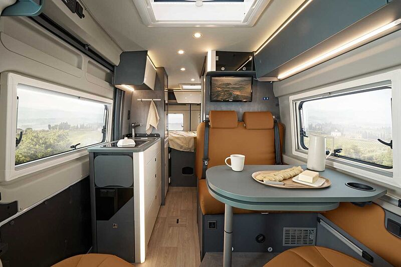Serienausstattung: Chassis-/GewichtsvariantenFiat Ducato Light 3.500 kg 2.2 180 PS (Light Duty) + AutomatikgetriebeBasisReifenreparaturset Fix & Go60 l KraftstofftankElectronic Stability Control: ESC, ABS, ASR, Hill Holder, Roll Over Mitigation, Crosswind Assist, Trailer Stability Control System, Post Collision Braking SystemTempomatTraction+, Hill Descent ControlAußenspiegel elektrisch verstellbar u. beheizbar, mit integrierten BlinkleuchtenElektrische Fensterheber im FahrerhausFahrer- und BeifahrerairbagHöhenverstellbares LenkradLenkrad und Schaltknauf in EchtlederManuelle Klimaanlage im FahrerhausRadiobedienung am LenkradVorbereitung für DAB-Autoradio und Lautsprecher im FahrerhausAntenne DABEco-Pack mit Start&StopZentralverriegelung Fahrerhaus und WohnraumVorrichtung DieselheizungNebelscheinwerfer mit KurvenlichtInduktive Smartphone-LadestationDigitale Instrumentenanzeige mit 7 TFT-FarbdisplayTPMS (Reifendruckkontrollsystem)Elektrische FeststellbremseFull-LED-ScheinwerferAdaptive Geschwindigkeitsregelanlage (ACC) > 30km/hAutonomer Notbremsassistent mit Fußgänger- und Radfahrererkennung, Spurhalteassistent (Lane Support System), Regen- und Dämmerungssensor, Verkehrszeichenerkennung + FernlichterkennungKlimaautomatik mit PollenfilterChassis-Außenfarbe Mugello Grün18“ Racing-Leichtmetallräder (bronze)AufbauXPS, Boden und Dach, Wände und Dach isoliert mit Alu-EcofiberDoppelbodenstauraum mit Innenbeleuchtung (Sitzgruppe)Panorama-Dachluke 70 × 50 cm im WohnraumDachluke 40 × 40 cm im SchlafzimmerDachluke 28 x 28 cm im BadFenster im BadElektrische Trittstufe (Aufbautür)RahmenfensterAusbauDrehbare Fahrerhaussitze mit Armlehnen, höhenverstellbar, im Wohnraumstoff bezogenMaximierte Innenraumhöhe im Fahrerhaus und über WohnsitzgruppeStaufächer und indirekte Beleuchtung in der T-HaubeKopfstützen Sitzgruppe mit HöhenregulierungGarderobenschrank mit AuszugsschieneOptimierter Möbelbau für Anti-Kondensations-Effekt, Luft- und Wärmezirkulation sowie optimale Wärmeverteilung in Wohn- und SchlafraumWohnraumdecke gepolstert und verkleidetISOFIX (2 Sitzplätze)Ausziehbarer TischHeckstauraum mit vier VerzurrösenHerausnehmbare Trennwand zwischen Wohn- und Laderaum mit Tür für InnenzugangVerdunklungsplissee Fahrerhaus für Front- und SeitenscheibenSchiebetür mit FliegengitterWohn- und Schlafraum & BeleuchtungBetten mit HolzlattenrostVerstellbare Leselampen mit USB-SteckdosenLED BeleuchtungskonzeptKlappbare Heckbetten zur einfachen Beladung von sperrigem GepäckKomfortable "Ergonomy"-Matratzen, Anti-Milben, mit atmungsaktivem Stretch-Futter, waschmaschinenfestIndirekte Beleuchtung, dimmbarSchlafzimmerwände mit Eco-Leder-VerkleidungKücheKüchenoberfläche und Tisch, kratzfest und pflegeleicht (Fenix®)2-Flammen-Kochfeld und Spülbecken aus EdelstahlKompressor-Kühlschrank 84 lKüchenschubladen softclose230 V Steckdose in der KücheIndirekte Beleuchtung unter der KüchenplatteKlappbares Regal in der KücheBadezimmerVariobad mit integrierter abtrennbarer Maxi-DuscheToilette und herausnehmbarer Tank (frostbeständig)Schiebetür zum BadDuscheinlage aus HolzInstallation & TechnikDieselheizung Combi 6 - 6kWHeizung mit digitalem Bedienpanel und ZeitsteuerungAutomatisches Batterieladegerät 22 ABord-Kontrollpanel mit LED-AnzeigeWohnraumbatterie (95 Ah)Stromversorgung und Aufladen mobiler Geräte über USB-SteckerSteckdose in der GarageStauraum für 2 GasflaschenFrischwassertank innenliegend, leicht zugänglich, elektrische TauchpumpeAbwassertank mit SicherheitsventilAbflussrohre mit Siphon und Abwassertank mit externer Entlüftung, gegen GeruchsbildungBeheizter AbwassertankVorbereitung RückfahrkameraLED-Außenleuchte und Raintech-System über SchiebetürAbwassertank, isoliertMultimediaTV-Fach im Wohnraum mit Halbinsel und indirekter BeleuchtungTV-Vorbereitung (Strom- und SAT-Kabel)