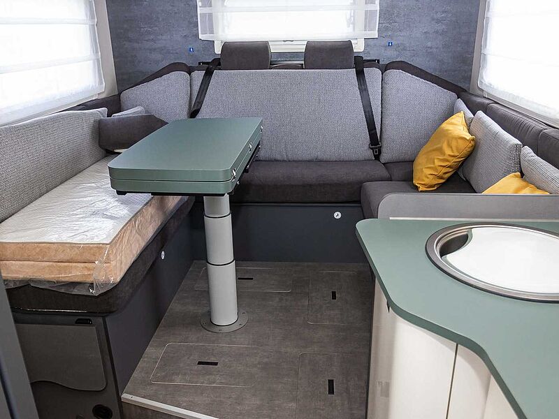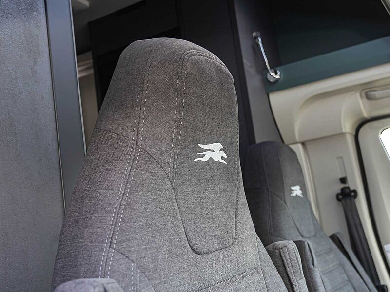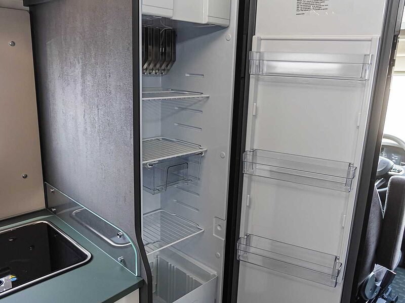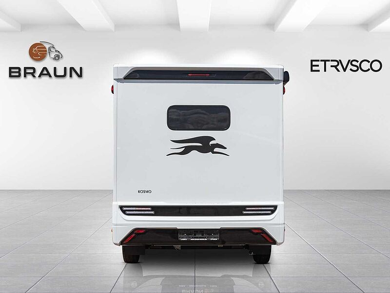 - Komfort Paket Kosmo L (Duscheinlage aus Holz, Fahrerhausteppich, Dunstabzugshaube, Isolierter Abwassertank, Beheizter Abwassertank, T-Haube mit Skyview zum Öffnen, Schlafzimmerwände in Eco-Leder verkleidet, Ausziehkörbe und -schränke in der Küche, Premium XL-Aufbautür mit Fernbedienung, Zentralverriegelung, Fenster Verdunkelung, Ablagefach und Gasdruckstoßdämpfer, Vorbereitung Rückfahrkamera, Auf den Wohnraum abgestimmte Sitzbezüge)