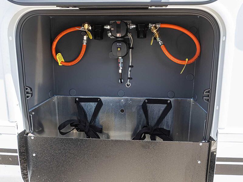 Technik: • LED Beleuchtungskonzept • Verstellbare Leselampen mit USB Steckdosen • Nachtbeleuchtung an allen Stufen • Gasheizung Combi, mit Wärmeverteilung im gesamten Wohnmobil, einschl. Garage und Fahrerhaus • Heizung mit digitalem Bedienpanel und Zeitsteuerung • Bord-Kontrollpanel mit LED-Anzeige • Automatisches Batterieladegerät 20 A • Wohnraumbatterie (95 Ah) • Stromversorgung und Aufladen mobiler Geräte über USB-Stecker • Stauraum für 2 Gasflaschen • Frischwassertank innenliegend, leicht zugänglich, elektrische Tauchpumpe • Abwassertank mit Sicherheitsventil • Abflussrohre mit Siphon und Abwassertank mit externer Entlüftung, gegen Geruchsbildung