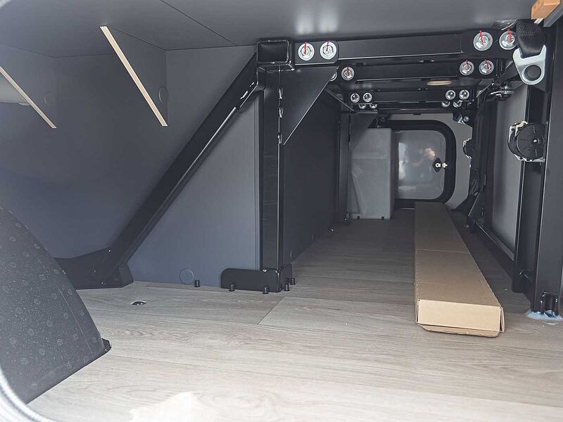 KAROSSERIE: • XPS-Wärmedämmung • Alu-Wände • GFK-Dach • LED-Heckscheinwerfer • GFK-Unterboden • Garage mit tiefer Ladefläche, rutschfestem Bodenbelag, beleuchtet, beheizt und Zurrschiene mit variablen Ösen • Garage mit maximaler Nutzlast 150 kg • Steckdose in der Garage • Einstiegshilfe • Aufbautür mit Fenster und Verdunklung • Rahmenfenster mit Verdunkelung und Moskitonetz